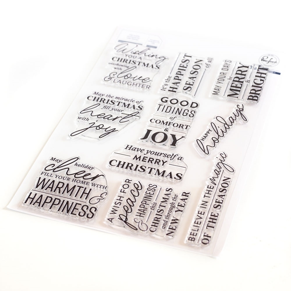 Σετ με 10 διάφανες σφραγίδες από τη συλλογή Holiday Large Sentiments που έχει σχεδιάσει η Kaitlin Sheaffer για την Pinkfresh Studio.