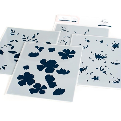 Σετ με 4 layering στένσιλ της Pinkfresh Studio. Χρησιμοποιήστε τα για να δημιουργήσετε μια πολυ-επίπεδη εικόνα με λουλούδια.