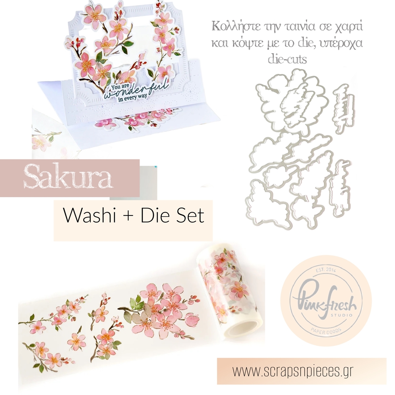 - Pinkfresh Studio Dies - Sakura: 4 μεταλλικές μήτρες κοπής με το περίγραμμα των λουλουδιών και των φράσεων.