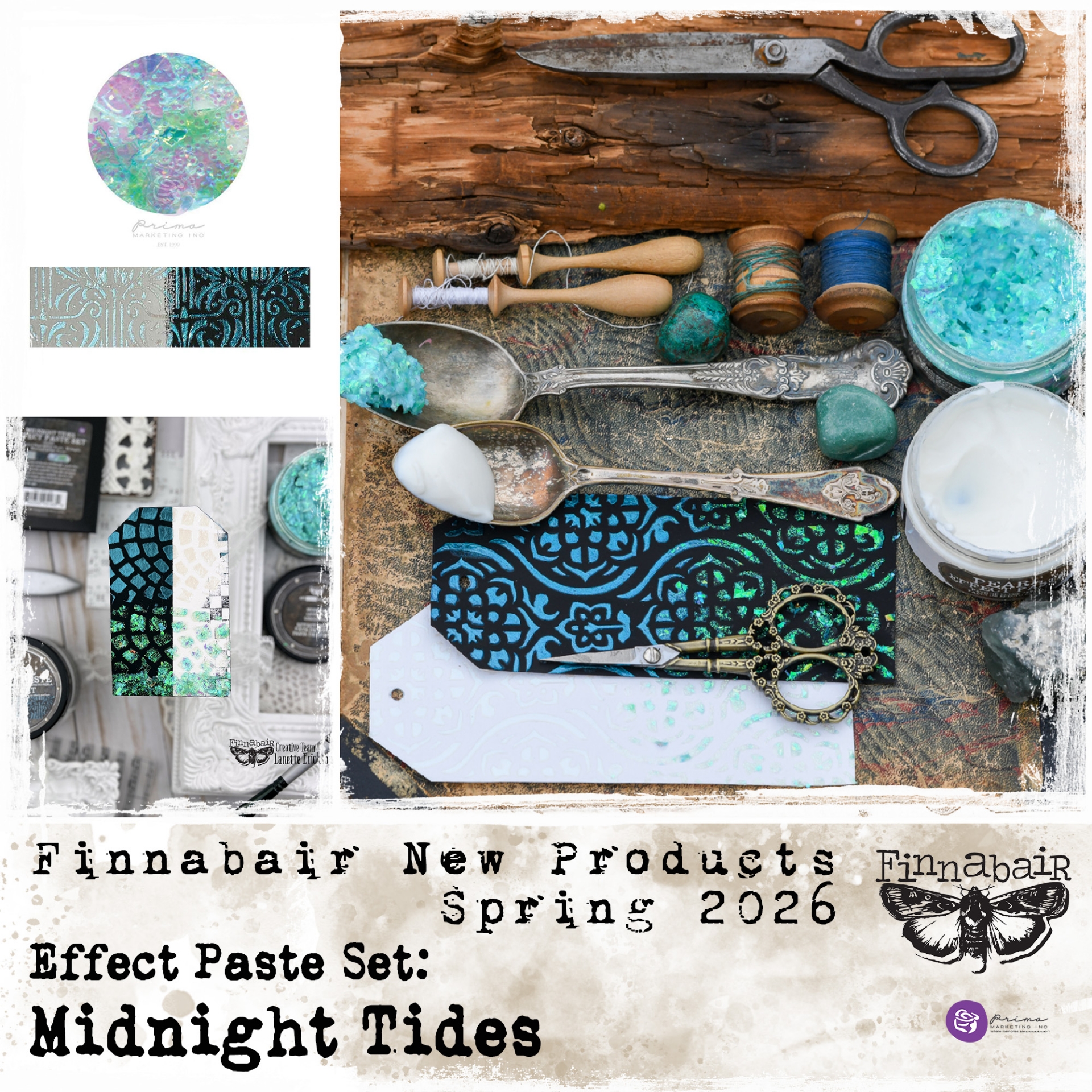 Το Midnight Tides Effect Paste Set από τη Prima Marketing και τη σειρά Finnabair Limited Edition είναι ένα σετ με δύο πάστες εφέ, σχεδιασμένο για έργα που θέλουν πλούσια υφή, βάθος και έντονο χρωματικό παιχνίδι. Η Midnight Enchanted Pearl Effect Paste δίνει ένα ιριδίζον αποτέλεσμα με teal-blue αντανακλάσεις που αλλάζουν όμορφα πάνω σε ανοιχτόχρωμες αλλά και σκούρες επιφάνειες. Δίπλα της, η Mermaid Effect Paste προσθέτει φωτεινή μεταλλική λάμψη και πιο έντονη κίνηση, δημιουργώντας μαζί ένα αποτέλεσμα εμπνευσμένο από τη θάλασσα, με shimmer, βάθος και διάσταση.