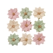 👉 Η συσκευασία περιέχει 9 χάρτινα λουλούδια σε 3 χρώματα (απαλό ροζ, πράσινο και μπεζ). Τα λουλούδια έχουν στο κέντρο χρυσές και άσπρες περλίτσες και μικρά φύλλα σε ανοιχτό πράσινο.