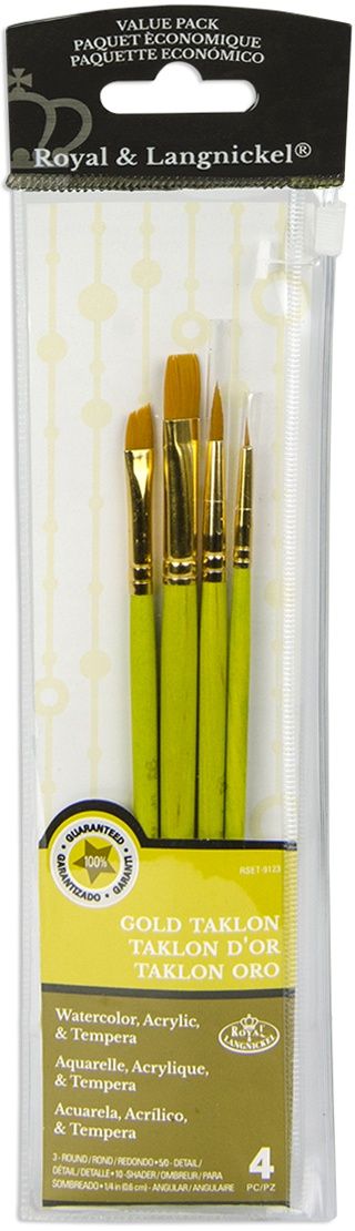 Το Royal & Langnickel Gold Taklon Value Pack RSET-9123 είναι ένα μικρό, χρήσιμο σετ πινέλων για καθημερινή ζωγραφική και δημιουργικές τεχνικές. Ο συνδυασμός των τεσσάρων σχημάτων που περιλαμβάνει το κάνει ιδιαίτερα πρακτικό, γιατί σου δίνει τα βασικά για να κινηθείς από τη λεπτομέρεια μέχρι το γέμισμα χρώματος μέσα στην ίδια σύνθεση. Το Round #3 είναι χρήσιμο για γενική εφαρμογή και πιο ελεγχόμενες πινελιές, το 5/0 Detailer για πολύ λεπτές γραμμές και μικρά στοιχεία, το #10 Shader για γέμισμα και πιο γεμάτα περάσματα χρώματος, ενώ το 1/4" Angular βοηθά σε γωνίες, λοξά περάσματα, φύλλα, πέταλα και πιο ελεγχόμενα σχήματα.