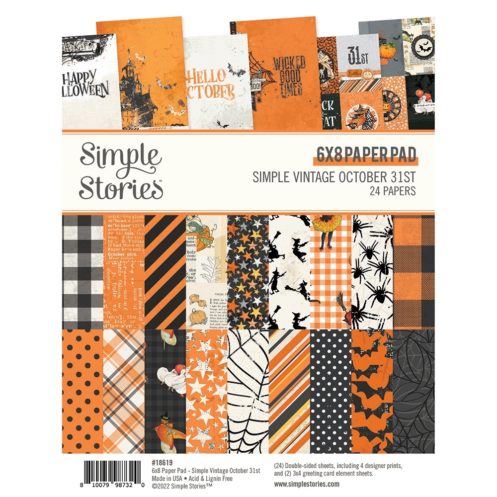 Μπλοκ scrapbooking από τη συλλογή Simple Vintage October 31st της Simple Stories. 24 φύλλα scrapbooking διπλής όψης (περιλαμβάνονται 4 σχέδια και 2 φύλλα με κάρτες 3"x4") με εικόνες με θέμα το Halloween.