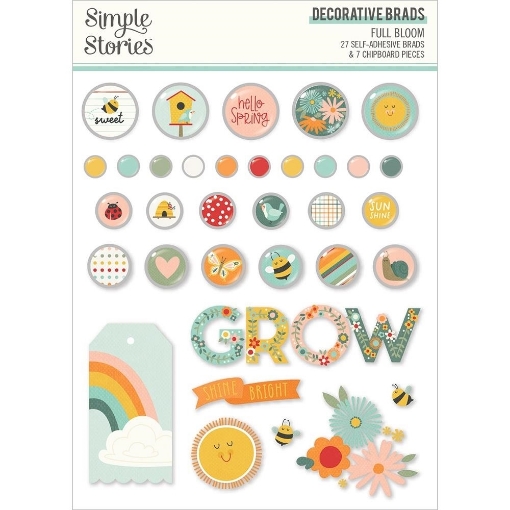 27 διακοσμητικά αυτοκόλλητα brads και 7 chipboard κομμάτια από τη συλλογή Full Bloom της Simple Stories. Εικόνες με ανθισμένα λουλούδια, πασχαλίτσες, σαλιγκάρια, κυψέλες, μέλισσες, quotes και άλλα.