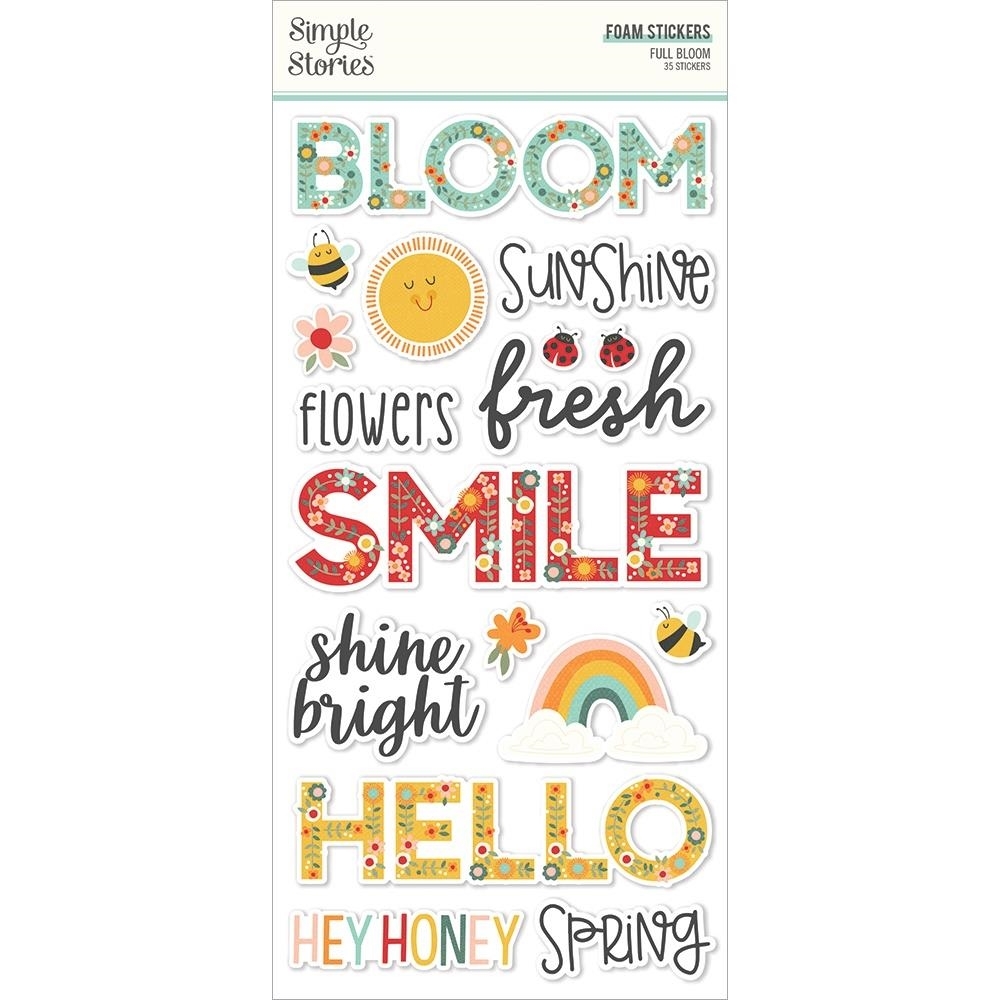 35 foam αυτοκόλλητα από τη συλλογή Full Bloom της Simple Stories. Εικόνες με ανθισμένα λουλούδια, πασχαλίτσες, μέλισσες, quotes και άλλα.