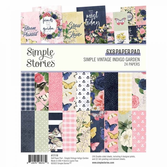 24 φύλλα scrapbooking διπλής όψης και 2 φύλλα με ευχετήριες κάρτες και elements από τη συλλογή Simple Vintage Indigo Garden της Simple Stories.