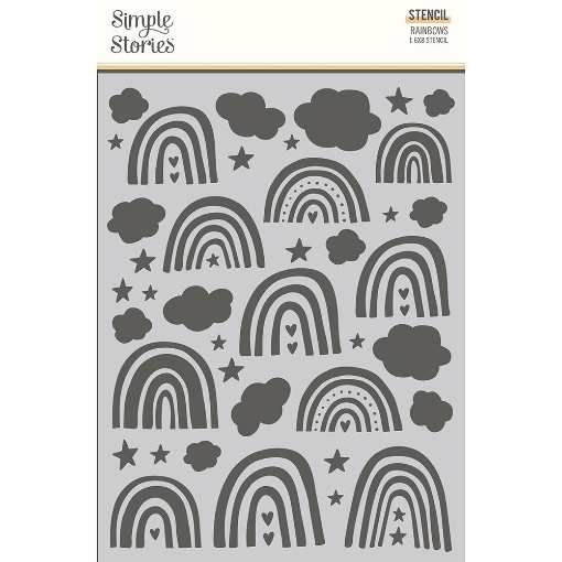 1 στένσιλ από τη συλλογή Boho Baby της Simple Stories με εικόνες από ουράνια τόξα, αστεράκια, σύννεφα και φεγγάρια.