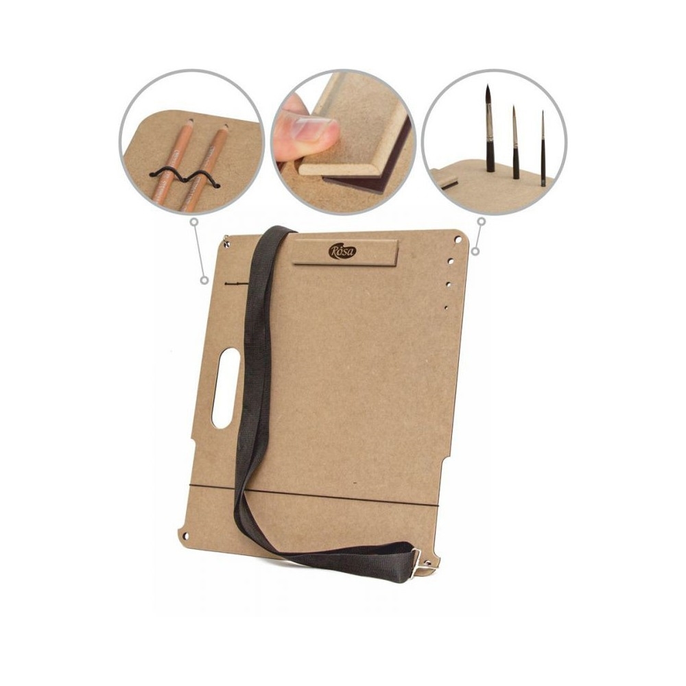Πινακίδα σχεδίασης από MDF με μαγνητικό clip στο πάνω μέρος και λάστιχο στο κάτω μέρος για να κρατάει το χαρτί σταθερό. Περιλαμβάνει λαβή καθώς και ρυθμιζόμενο ιμάντα για να το κρεμάτε στον ώμο για εύκολη μεταφορά. Επίσης έχει θέσεις για μολύβια ή μαρκαδόρους και πινέλα για να έχετε όλα κοντά σας εύκολα καθώς δημιουργείτε.