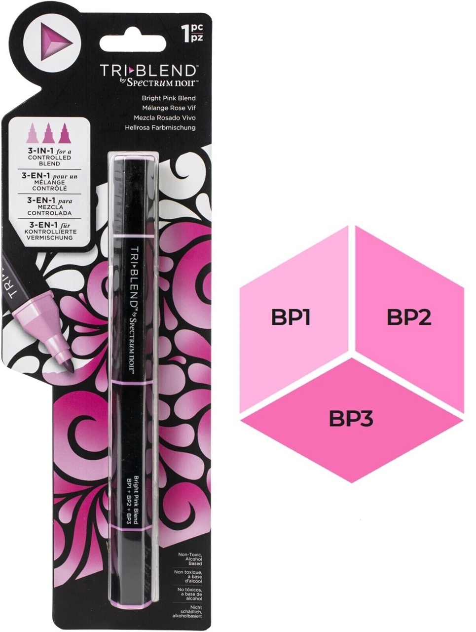Ο Spectrum Noir TriBlend Bright Pink Blend σου δίνει τρεις ζωηρές αποχρώσεις ροζ μέσα σε έναν μόνο μαρκαδόρο. Ξεκινάς με τον BP1 για βασική κάλυψη, προσθέτεις ένταση με τον BP2 και δίνεις βάθος με τον BP3. Στο τέλος, επιστρέφεις στον ανοιχτό τόνο για να μαλακώσεις τις μεταβάσεις και να διατηρήσεις τη φωτεινότητα του χρώματος.