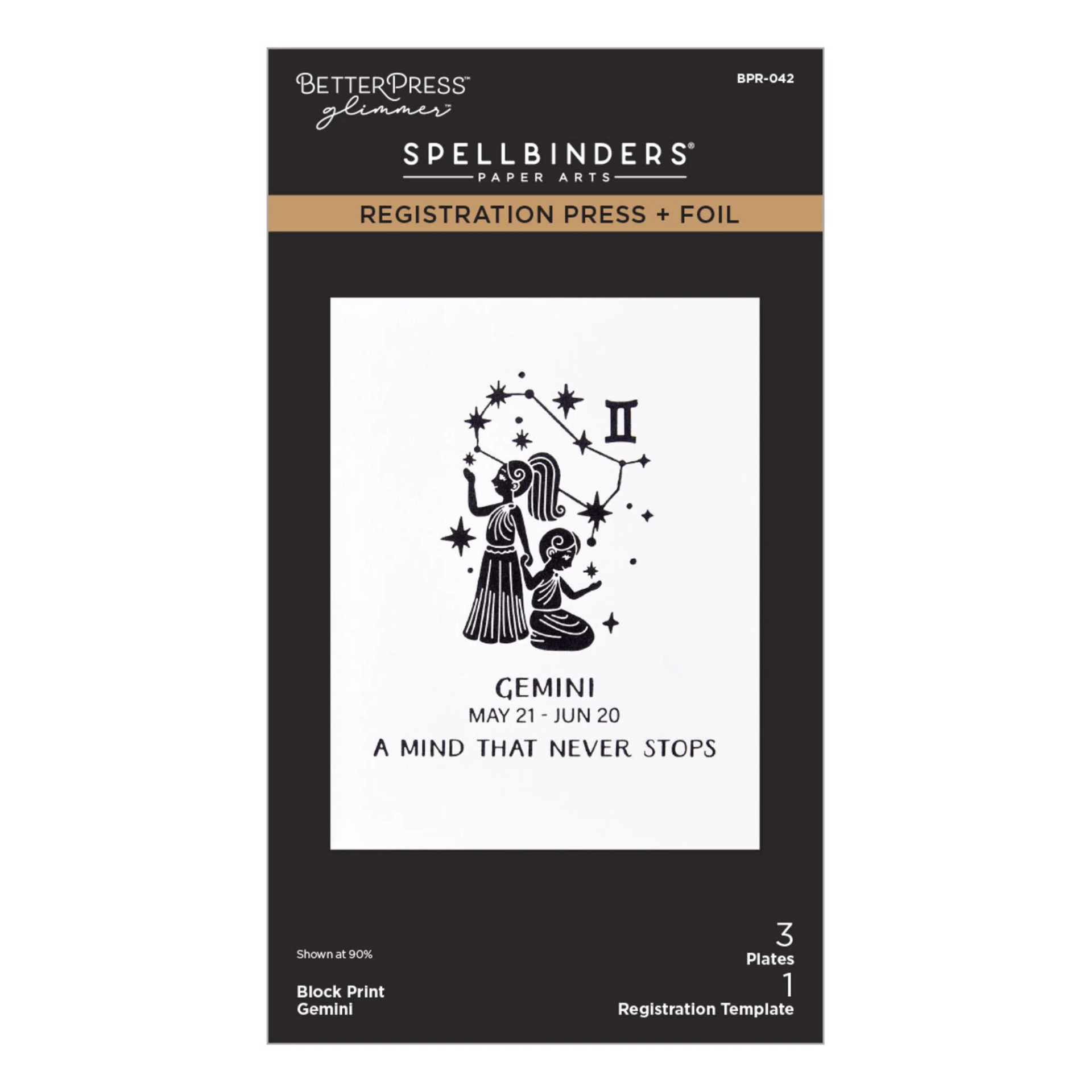 Το Block Print Gemini Registration Press + Foil Plate είναι σχεδιασμένο για να αποδίδει το ζώδιο των Διδύμων με καθαρές γραμμές και έντονη, γραφιστική αισθητική τύπου block print.