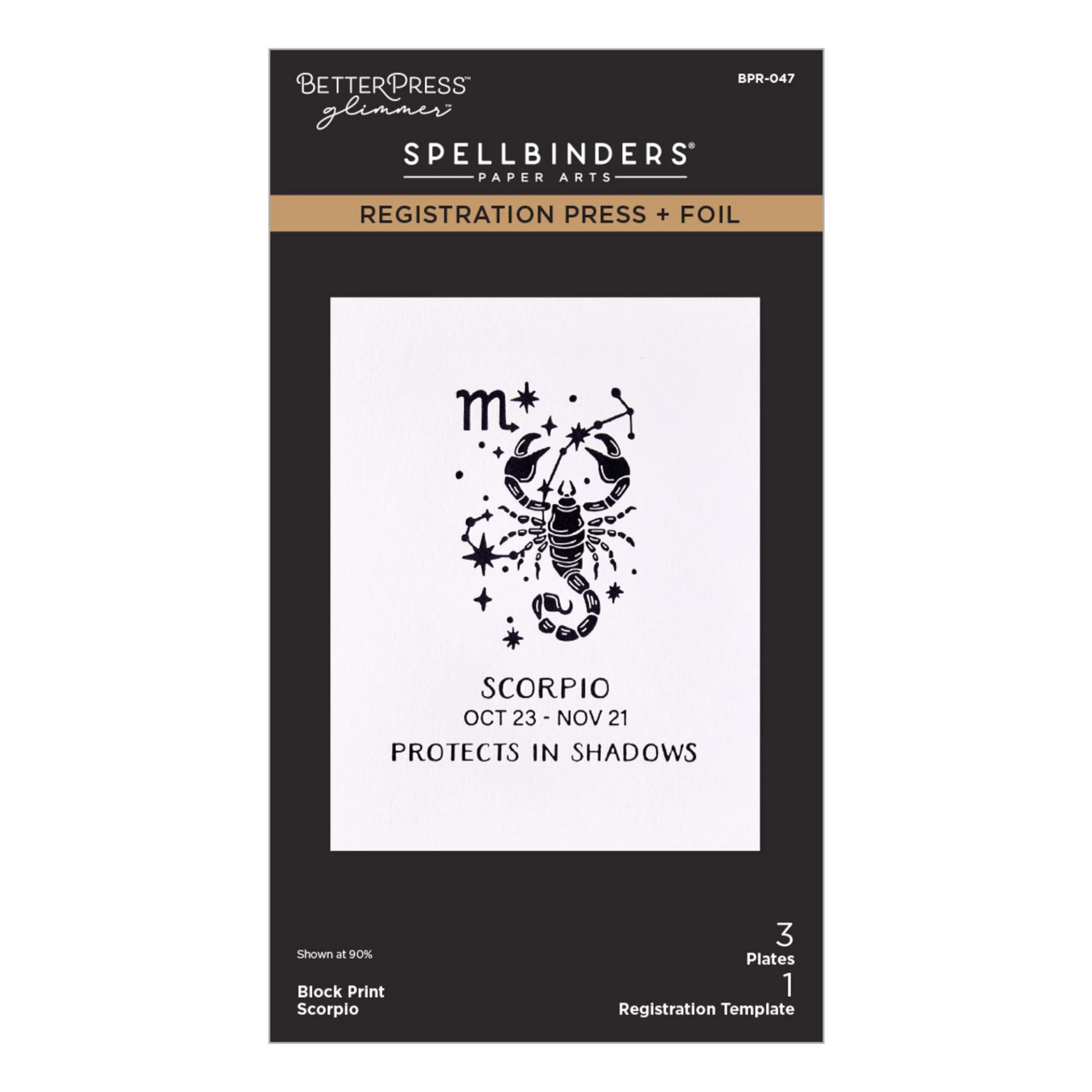 Το Block Print Scorpio Registration Press + Foil Plate είναι σχεδιασμένο για να αποδίδει το ζώδιο του Σκορπιού με καθαρές γραμμές και δυνατή, γραφιστική αισθητική τύπου block print.