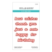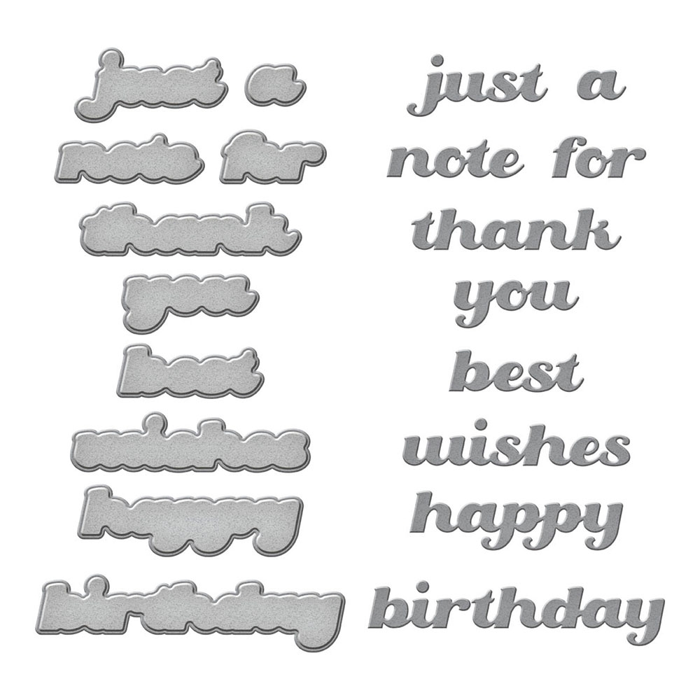 Σετ με 20 λεπτές μεταλλικές, etched μήτρες κοπής από την Spellbinders. Με τα sentiments happy, birthday, thank, you, for, best, wishes, just, a, and note και τις σκιές των λέξεων.