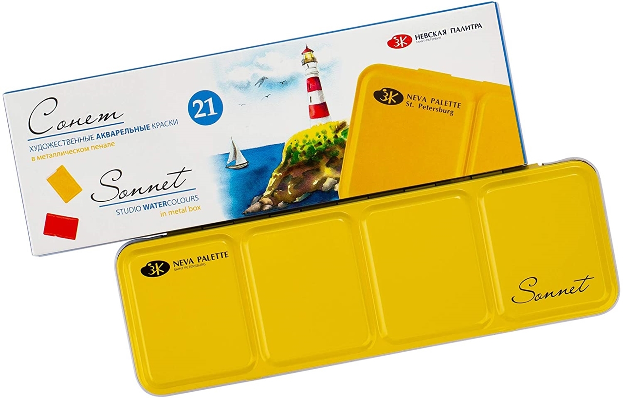 Η συσκευασία περιλαμβάνει 21 full pans ακουαρέλας στα παρακάτω χρώματα: Zinc White (100), Hanza Yellow (227), Medium Yellow (220), Dark Yellow (221), Gold Ocher (205), Orange (315), Light Red (336), Carmine (319), Madder Red (317), Azure (513), Light Ultramarine (501), Blue (515), Blue Green (514), Light Violet (605), Dark Violet (606), Emerald Green (720), Bladder Green (716), Dark Green (710), Toasted Sienna (406), Toasted Shadow (408), Black Lamp (801).