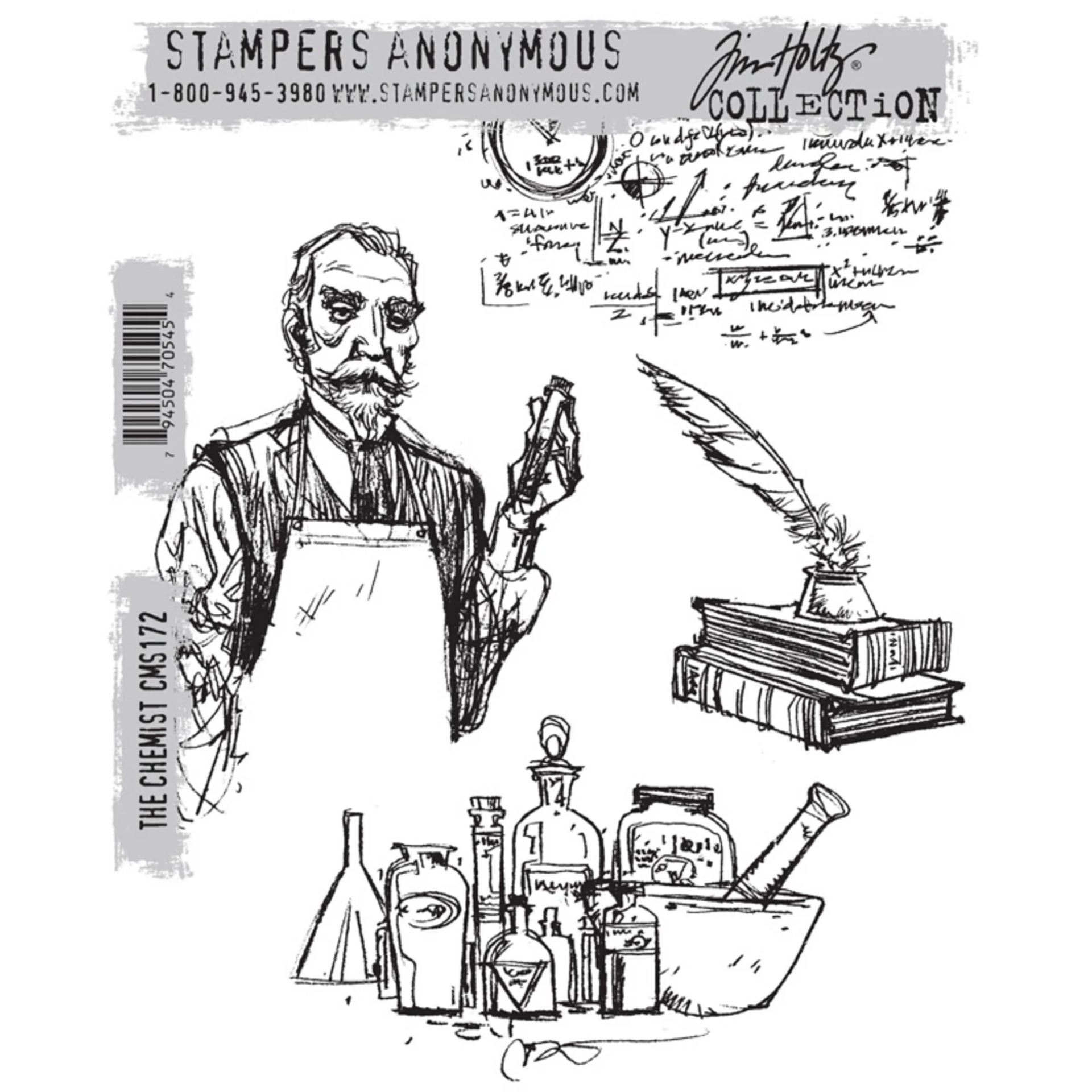 Η συλλογή “The Chemist” της Stampers Anonymous, σχεδιασμένη από τον Tim Holtz, είναι ένα ταξίδι στον κόσμο της επιστήμης μέσα από το βλέμμα της τέχνης. Φιαλίδια, αποστάτες, χημικά σύμβολα, τύποι και σχέδια αποτυπώνονται σε κάθε σφραγίδα με απίστευτη λεπτομέρεια. Το αποτέλεσμα θυμίζει σελίδες από παλιά επιστημονικά ημερολόγια ή blueprint σχεδιαγράμματα — ιδανικό για projects με steampunk, vintage ή industrial ύφος.