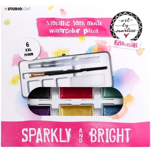 Η συσκευασία περιλαμβάνει 6 Extra Large pans, πινέλο, πινέλο νερού, σφουγγαράκι, mixing tray και color chart.