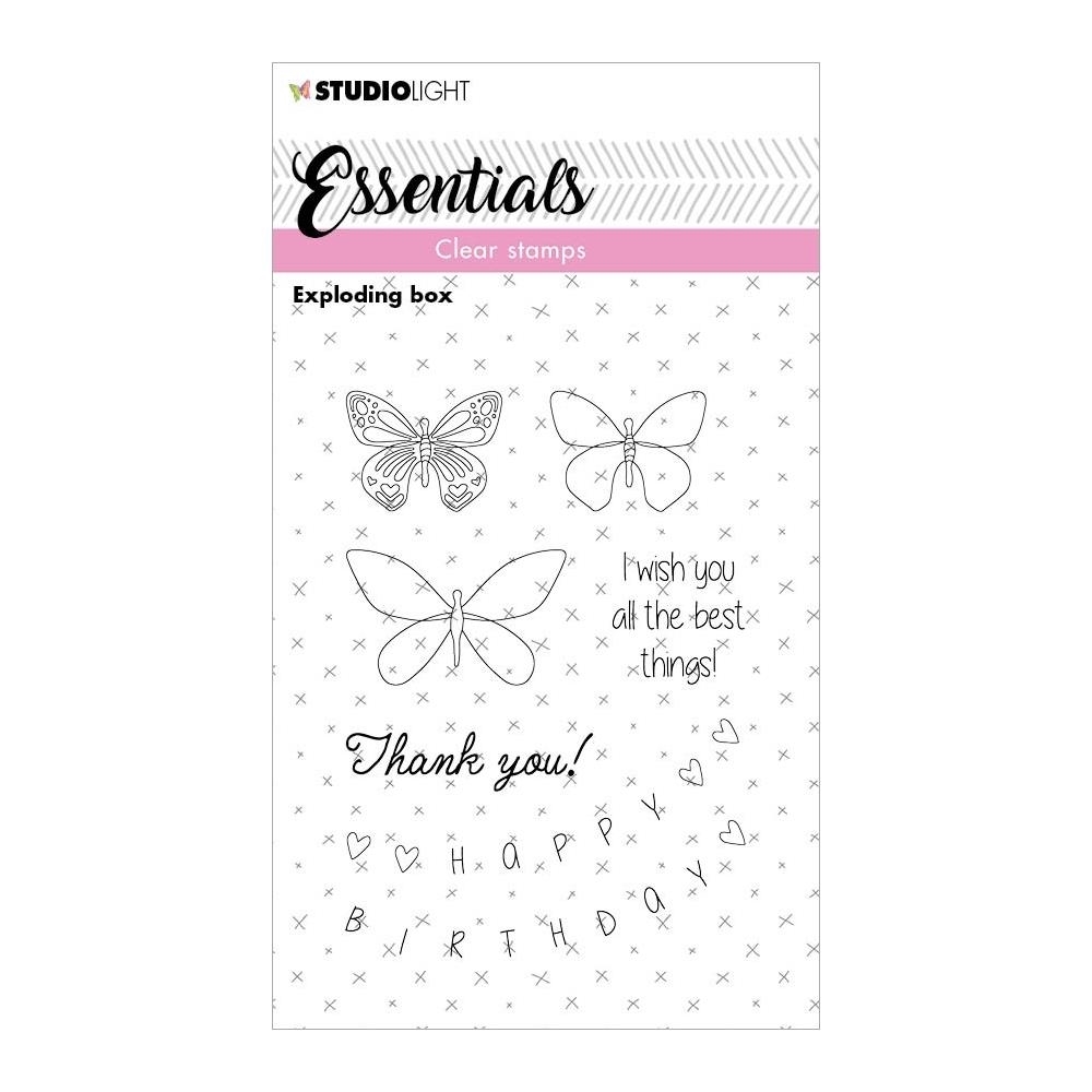 7 διάφανες σφραγίδες από τη συλλογή Essentials της Studio Light σε καρτέλα 7.5 x 10 cm με θέμα τα γενέθλια, με εικόνες από πεταλούδες και τις φράσεις "I wish you all the best things", "thank you" and "happy birthday".