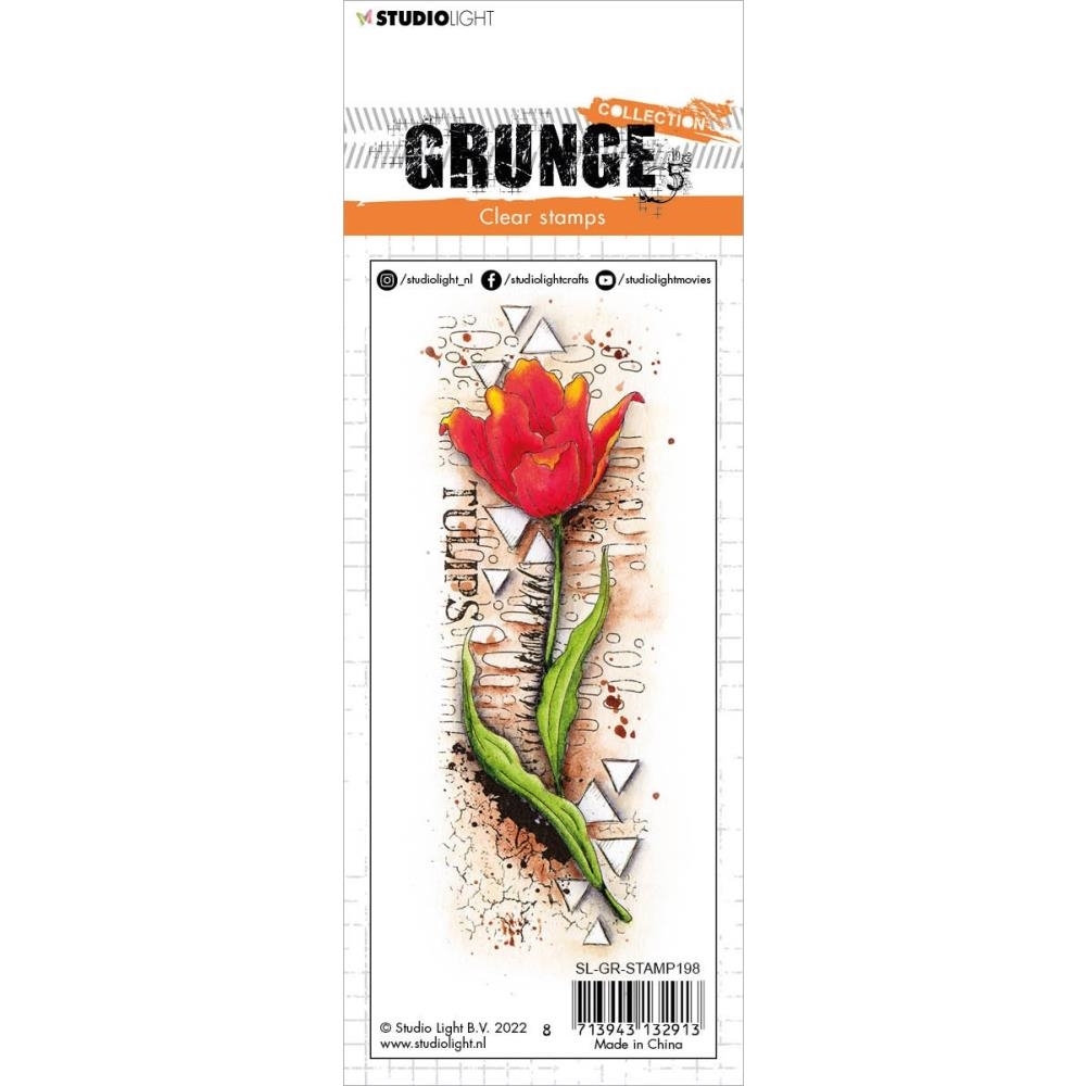 1 διάφανη σφραγίδα από τη συλλογή Grunge της Studio Light. Με εικόνες από μια ανθισμένη τουλίπα και τη λέξη "tulips".