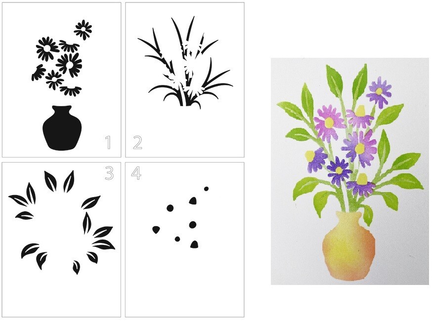 👉 Η συσκευασία περιέχει ένα στένσιλ με ένα βάζο με λουλούδια. Το στένσιλ έχει 4 ξεχωριστές επιλογές για layers που μπορούν να χρησιμοποιηθούν και μόνες τους και σε συνδυασμό μεταξύ τους.