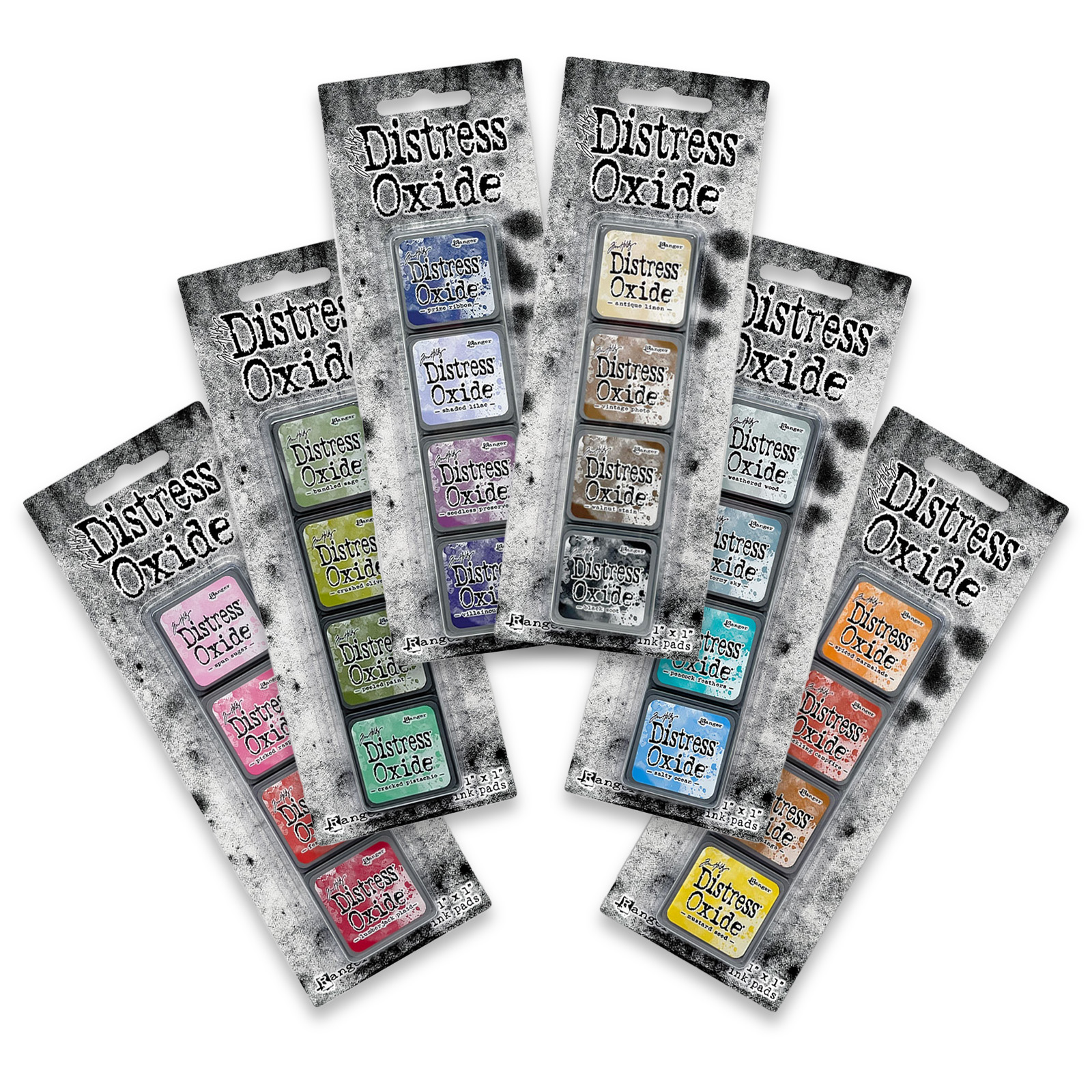 Mini pads με διάσταση 2.5 x 2.5 cm με τα γνωστά μελάνια Oxides του Tim Holtz. Τα Oxide είναι υδατο-δυαλυτά μελάνια που περιλαμβάνουν τόσο χρωστική (dye) όσο και pigments και δίνουν ένα μοναδικό εφέ οξείδωσης όταν βραχούν.