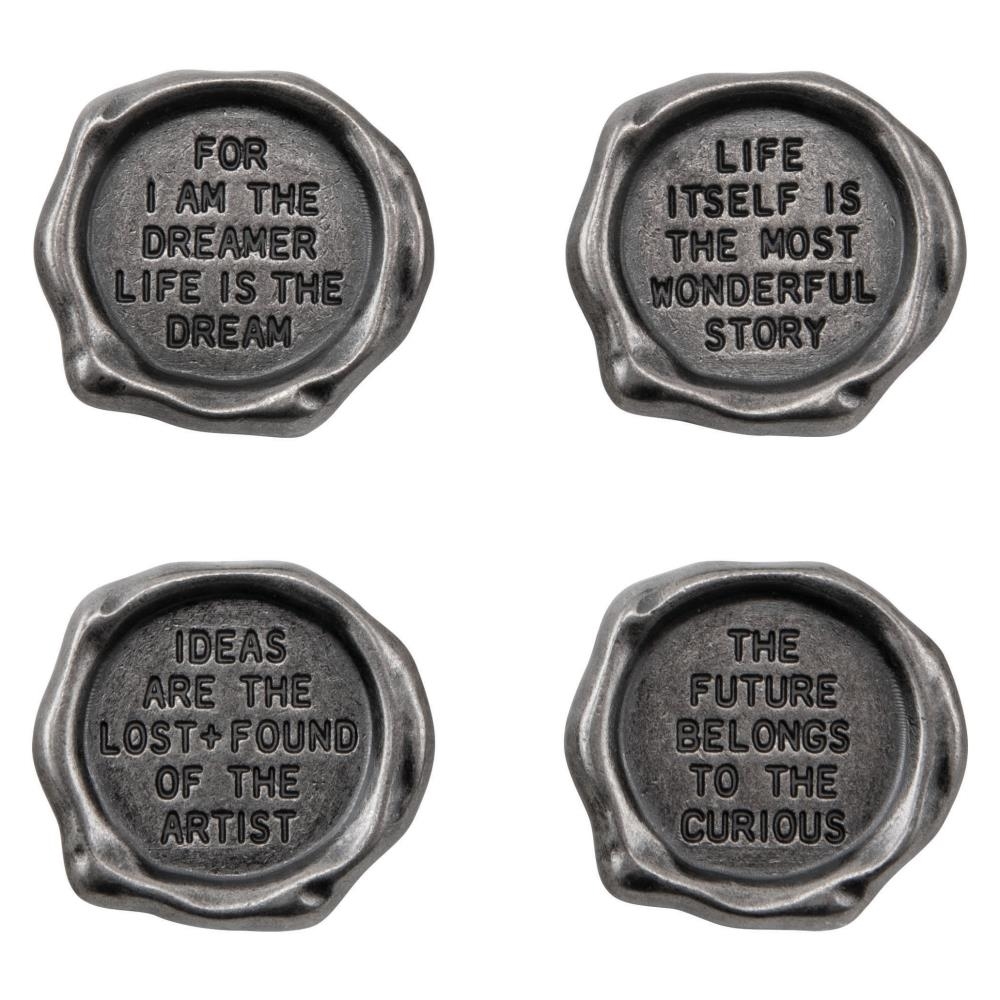 Η συσκευασία περιλαμβάνει 4 μεταλλικές, στρογγυλές σφραγίδες με φράσεις και διάμετρο 2.54cm.