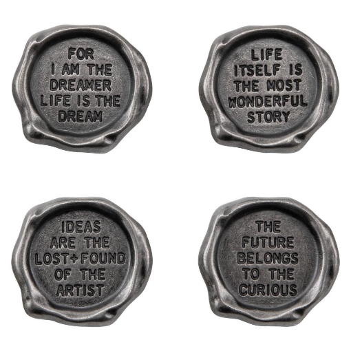 Μεταλλικές διακοσμητικές σφραγίδες από τον Tim Holtz με φράσεις που μοιάζουν να έχουν σφραγιστεί σε κερί. Κάθε σφραγίδα έχει και μία διαφορετική φράση.