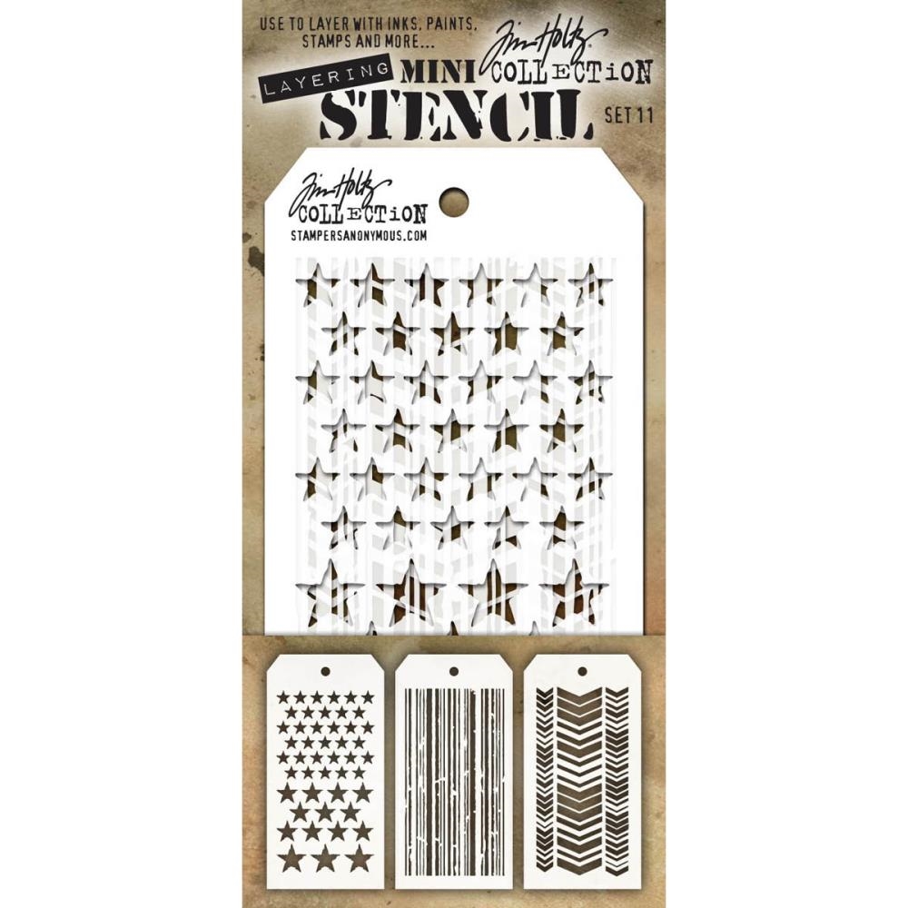 Το Mini Layered Stencil Set 11 – THMST011 του Tim Holtz για τη Stamper’s Anonymous συνδυάζει τρία κλασικά, δυναμικά μοτίβα σε μίνι διάσταση.