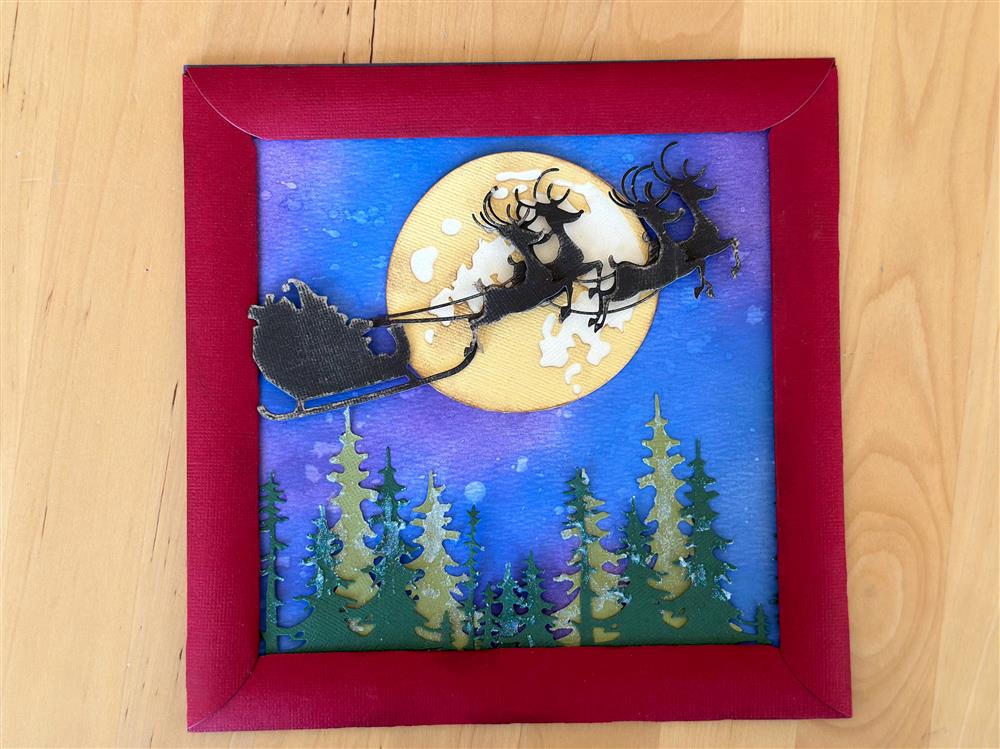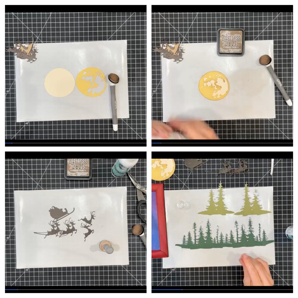 Έκοψα όλα μου τα dies σε διάφορες αποχρώσεις και μελάνωσα τις άκρες με Walnut Stain distress ink. Ειδικά για το έλκηθρο του Αγίου Βασίλη, το έκανα distress με ένα ελαφρύ γυαλόχαρτο για να φανεί ο καφέ πυρήνας του χαρτιού και να γίνει vintage! Φαίνεται ακόμα και στην φωτογραφία πόσο όμορφο είναι!