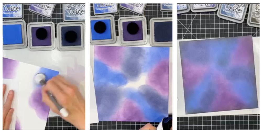 Για να βγει το βαθύ αποτέλεσμα που βλέπετε παρακάτω κάνω το εξής: Βαθαίνω σταδιακά το χρώμα σε layers. Δηλαδή στην αρχή, βάζω την πρώτη στρώση χρωμάτων και στην συνέχεια μελανώνω όλο το χαρτί ακόμα μια φορά, ενώ ταυτόχρονα κάνω το blending του ενός χρώματος μέσα στο άλλο και "βαθαίνω" το χρώμα. Για να βγει αυτό το βαθύ χρώμα που θέλω, συνήθως χρειάζεται τρία περάσματα. Εδώ χρησιμοποίησα τα χρώματα Villainous Potion, Chipped Sapphire, Blueprint Sketch and Black Soot για το γύρω γύρω.