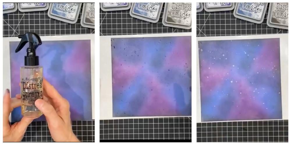 'Οπως βλέπετε στις φωτογραφίες, χρησιμοποιώ το distress sprayer του Tim Holtz, γιατί ανάλογα το πώς θα πατήσεις τη σκανδάλη, θα κάνει λεπτά ή πιο χοντρά σταγονίδια νερού, με αποτέλεσμα να φαίνονται διαφορετικά τα "αστέρια" του ουρανού μου. Μπορείτε να ρίξετε το νερό και με πινέλο ή με τα δάκτυλα, αλλά εμένα ποτέ δεν μου πετυχαίνει έτσι ομοιόμορφα, οπότε πάντα χρησιμοποιώ το distress sprayer.