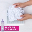 Η διαδικασία είναι απλή: τοποθέτησε το ύφασμα πάνω στο πλέγμα, ρίξε πάγο από πάνω και πρόσθεσε τις βαφές — καθώς ο πάγος λιώνει, τα χρώματα κυλούν και δημιουργούν μοναδικά, απαλής μετάβασης σχέδια.