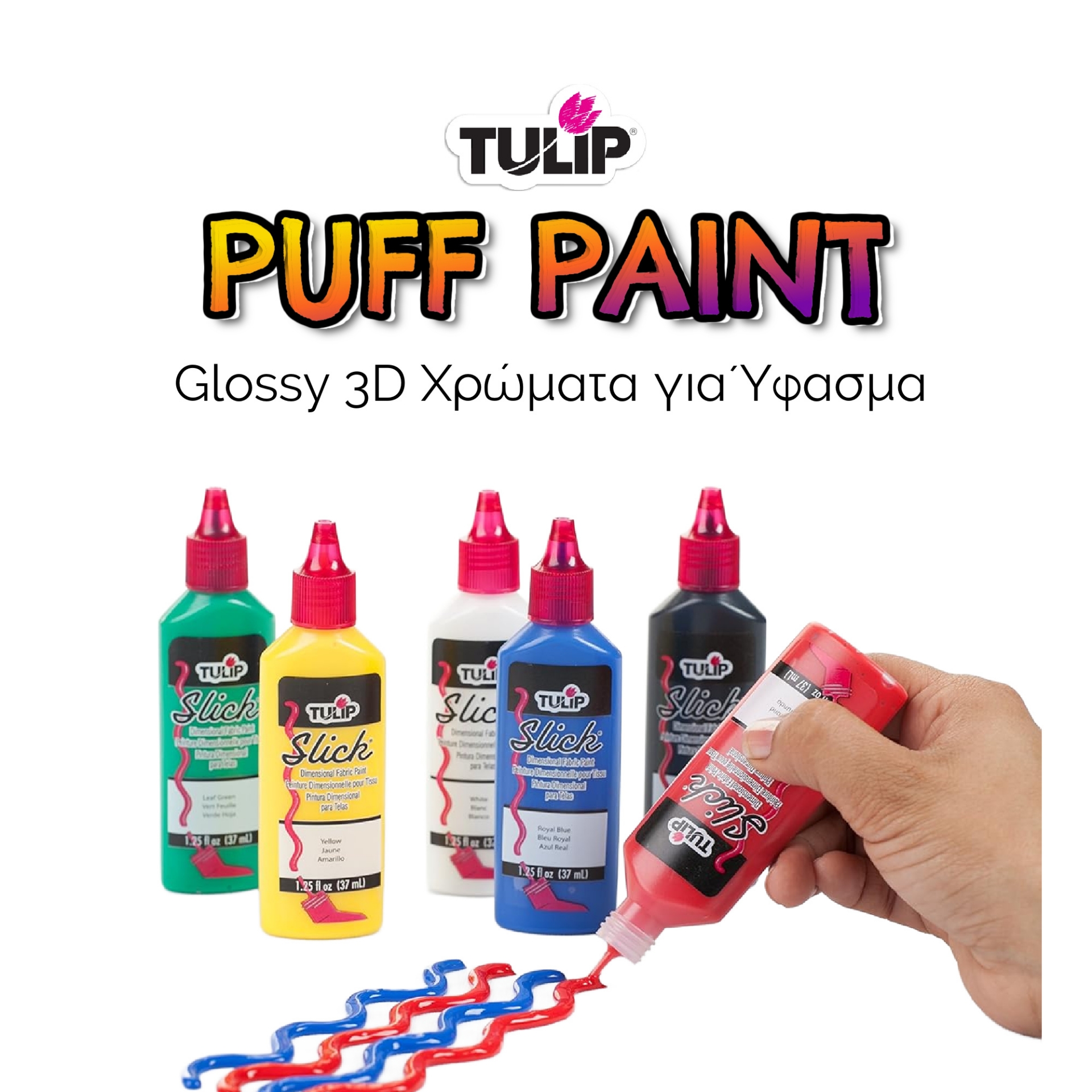 Τα Tulip Slick 3D Fabric Paints είναι ιδανικά για να προσθέτεις όγκο, υφή και γυαλιστερό αποτέλεσμα στις υφασμάτινες δημιουργίες σου.