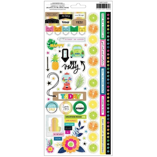105 cardstock αυτοκόλλητα από τη συλλογή Sweet Rush που έχει σχεδιάσει η Vicki Boutin για την American Crafts. Εικόνες με λουλούδια, παγώνια, φοίνικες, quotes και άλλα με χρυσές foil λεπτομέρειες.