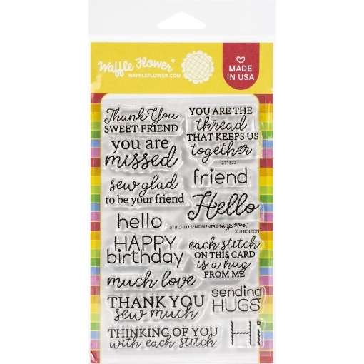 14 σφραγίδες clear της Waffle Flower Crafts με quotes με φράσεις όπως “Thank you sew much”, “Thinking of you with each stitch” καιάλλες.