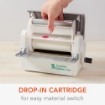 Είναι εξαιρετικά εύκολο στη χρήση. Τοποθετήστε μικρά αντικείμενα και χαρτιά στο μηχάνημα ενώ περιστρέφετε τη λαβή και χρησιμοποιήστε τον ενσωματωμένο κόφτη για να τα αφαιρέσετε ακέραια χωρίς σκουπιδάκια από το περίγραμμα. Και το αυτοκόλλητο σας είναι έτοιμο!